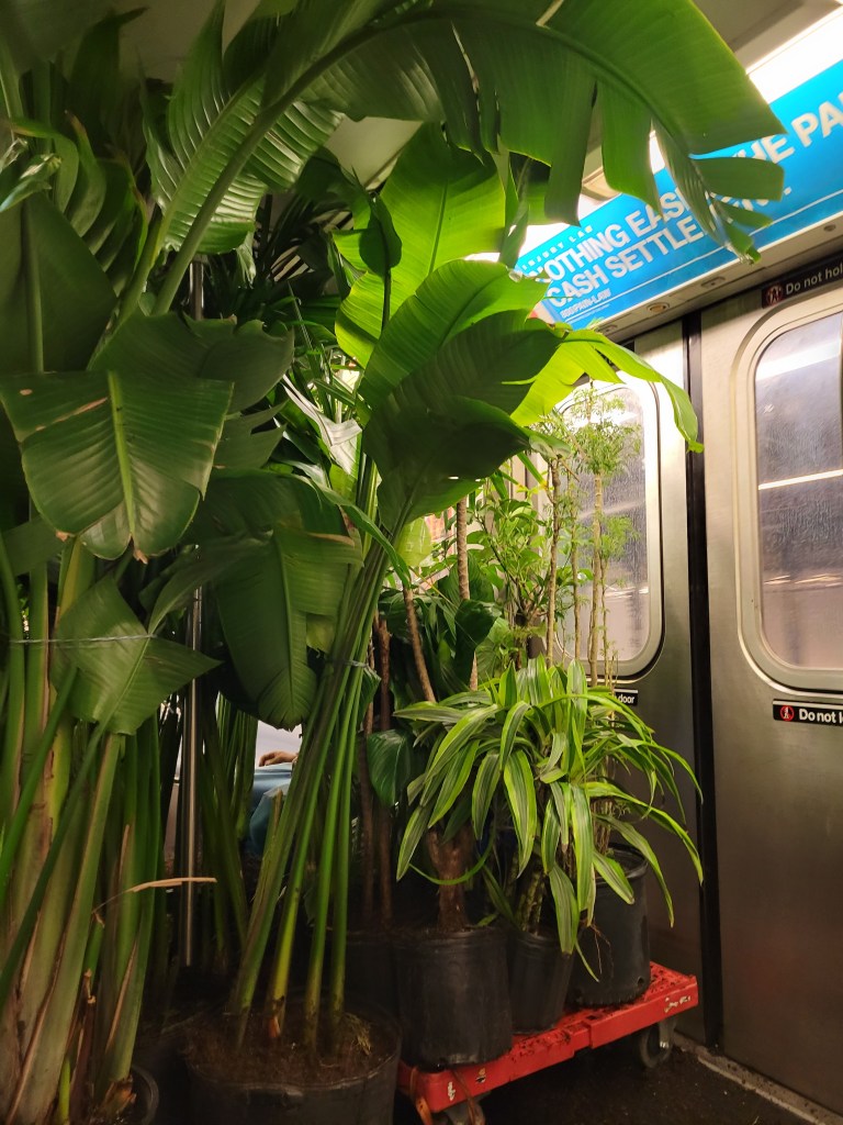 I was taking the train home and there was someone transporting these plants via train. I immediately noticed how the leaves and dewy soil refreshed the entire train car of its classic NY train car scent, this train car smelled particularly ripe from a malfunctioning air-conditioning system! I was also struck by how the greens of the leaves stood out in the stark silver and black subway environment. It was totally revitalizing. I would like to see more plants in the subway in order to make NY a better, brighter, and greener place!