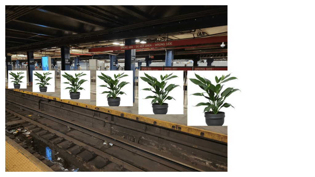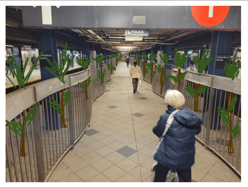 Leveraging the existing infrastructure to place potted plants in protected spaces at subway station stops. Pictured below, the plants are protected by fencing at the 59th/Columbus Circle station underpass. The specific plant species remains to be decided, but excellent research by the folks at the lowline project have determined the best kinds of plants to withstand sub-terrain conditions. I will collaborate with them to ensure plants are effectively selected to address concerns of humidity, smell, and rodents.